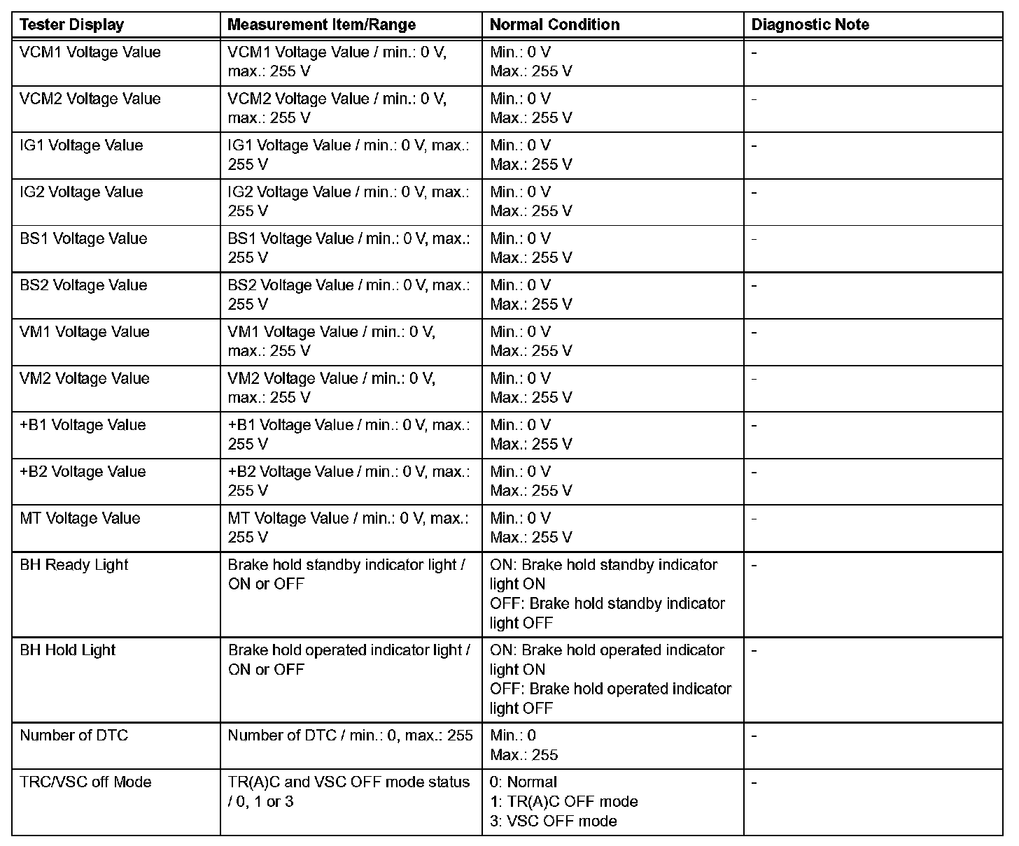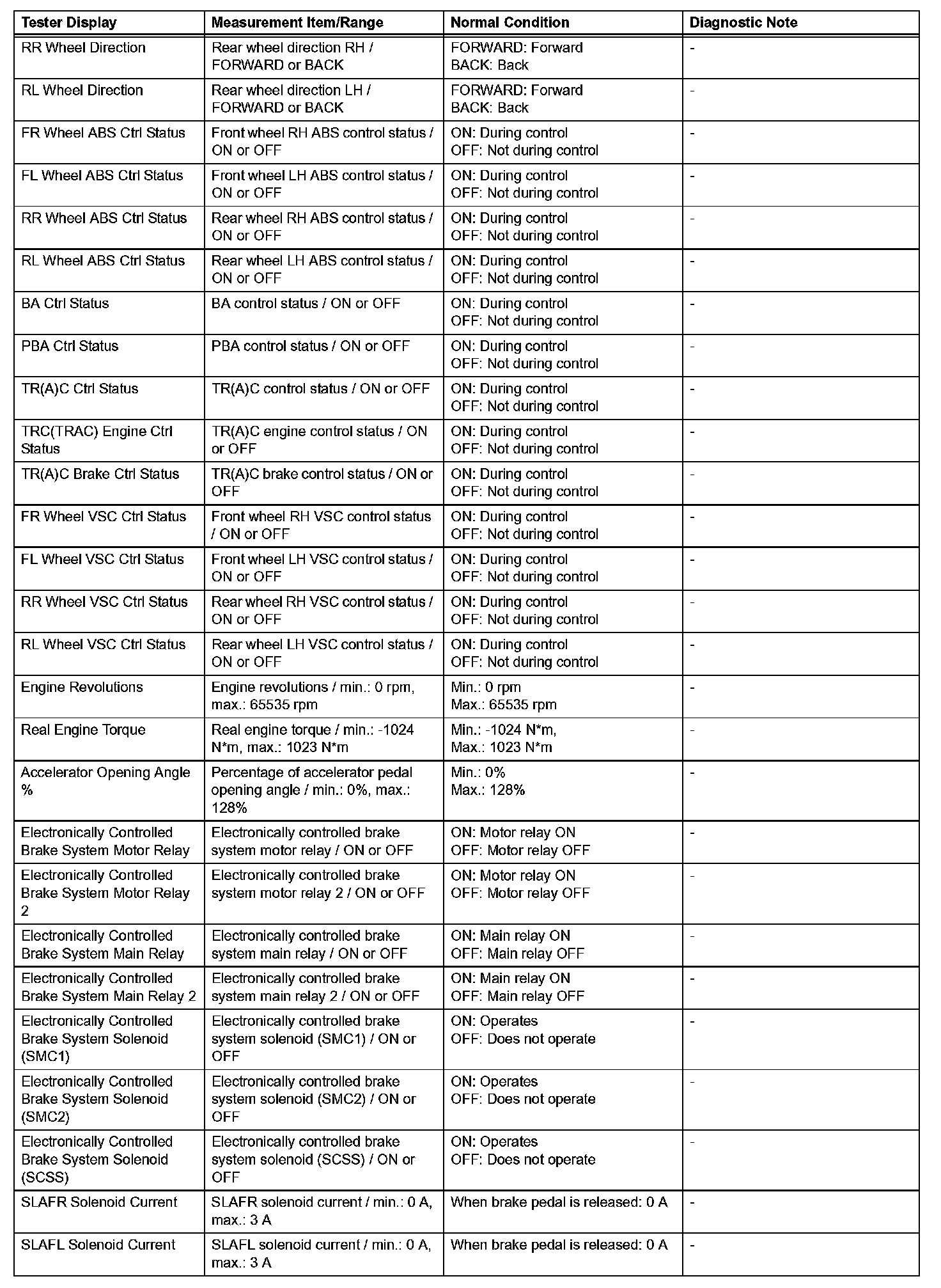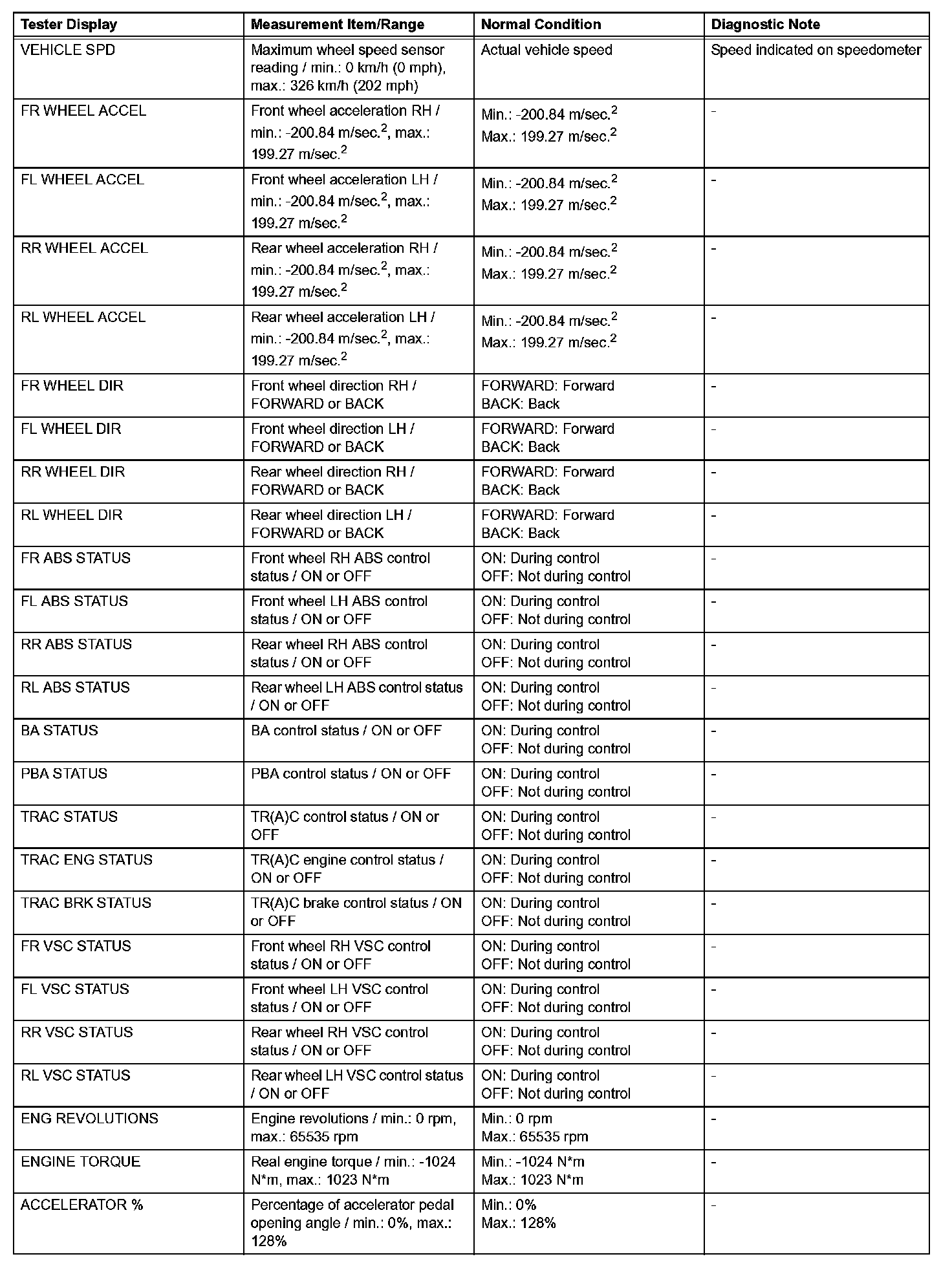 READ DATA LISTHINT: Using the intelligent tester or Techstream to read the Data List allows the values or states of switches, sensor, actuators and other items to be read without removing any parts. This non-intrusive inspection can be very useful because intermittent conditions or signals may be discovered before parts or wiring is disturbed. Reading the Data List information early in troubleshooting is one way to save diagnostic time.