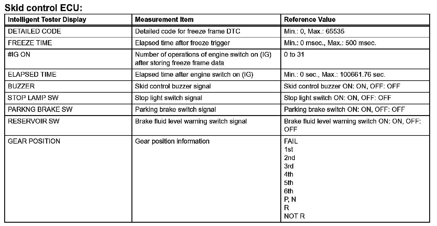 - Freeze frame data at the time a DTC is detected: When the skid control ECU stores data at the time a DTC is detected, no updates will be performed until the data is cleared.