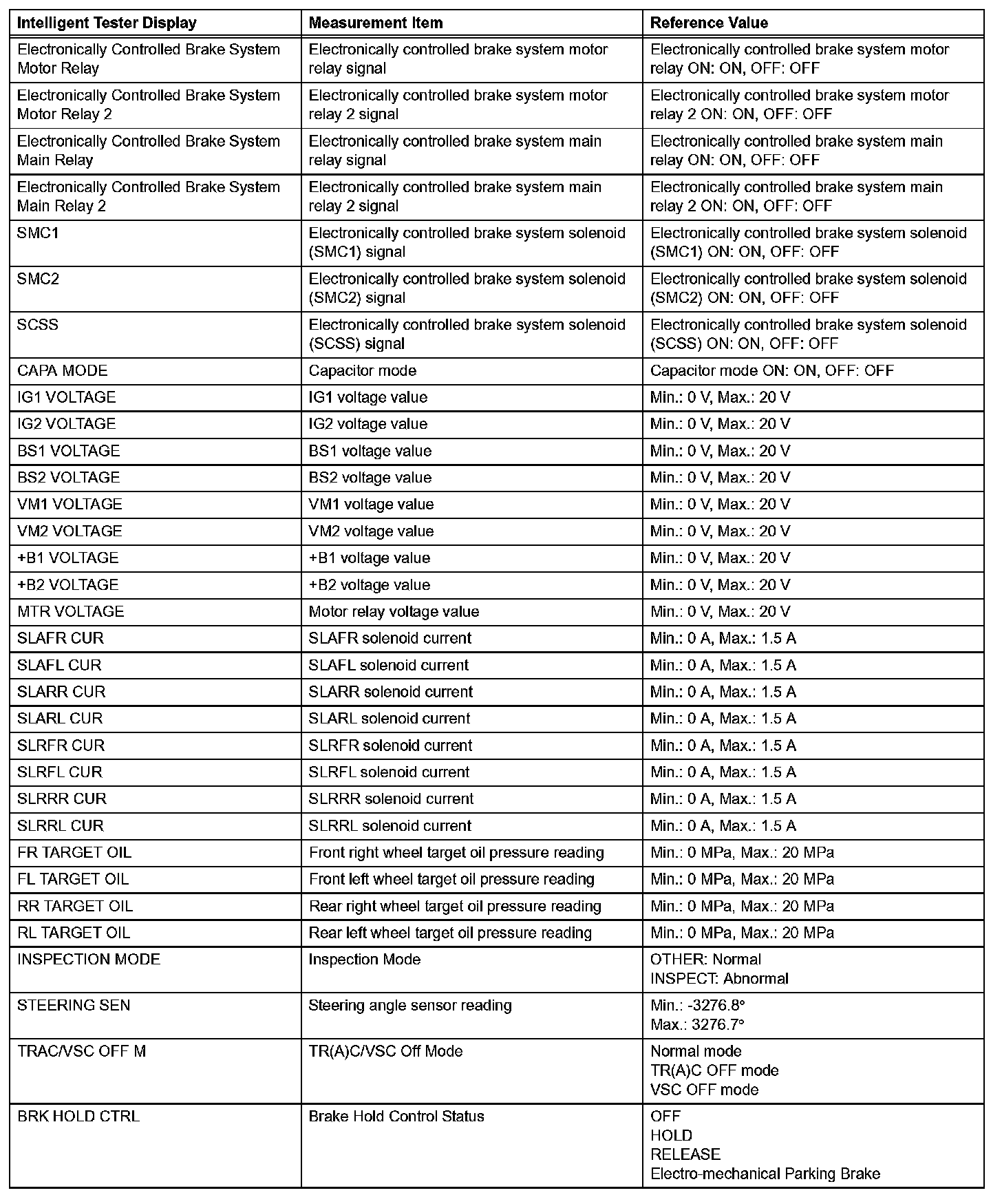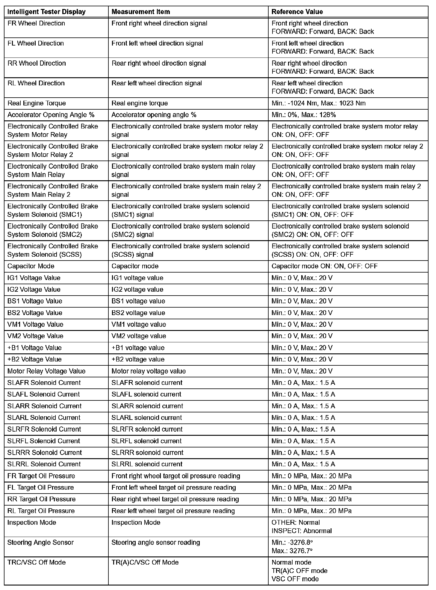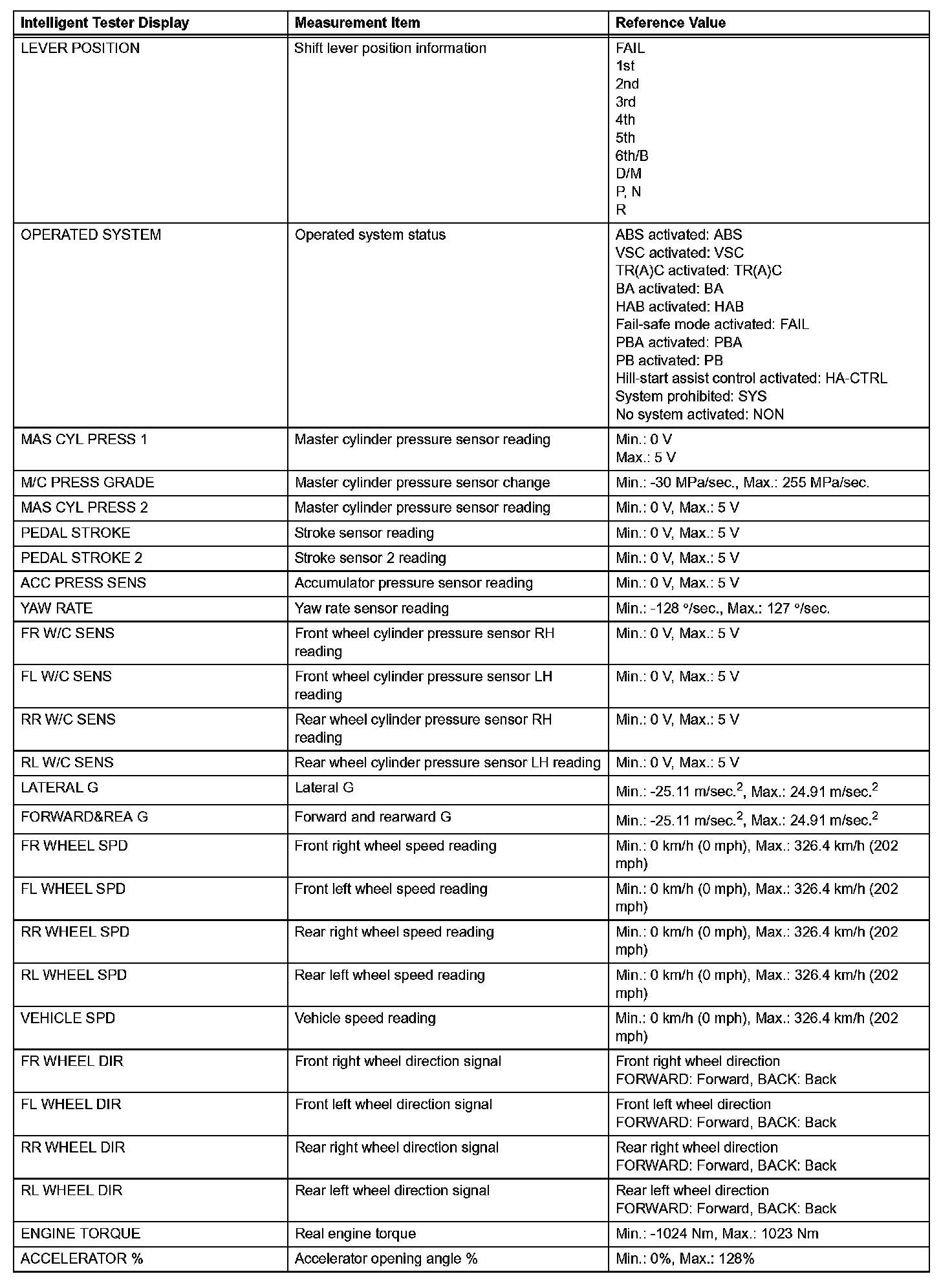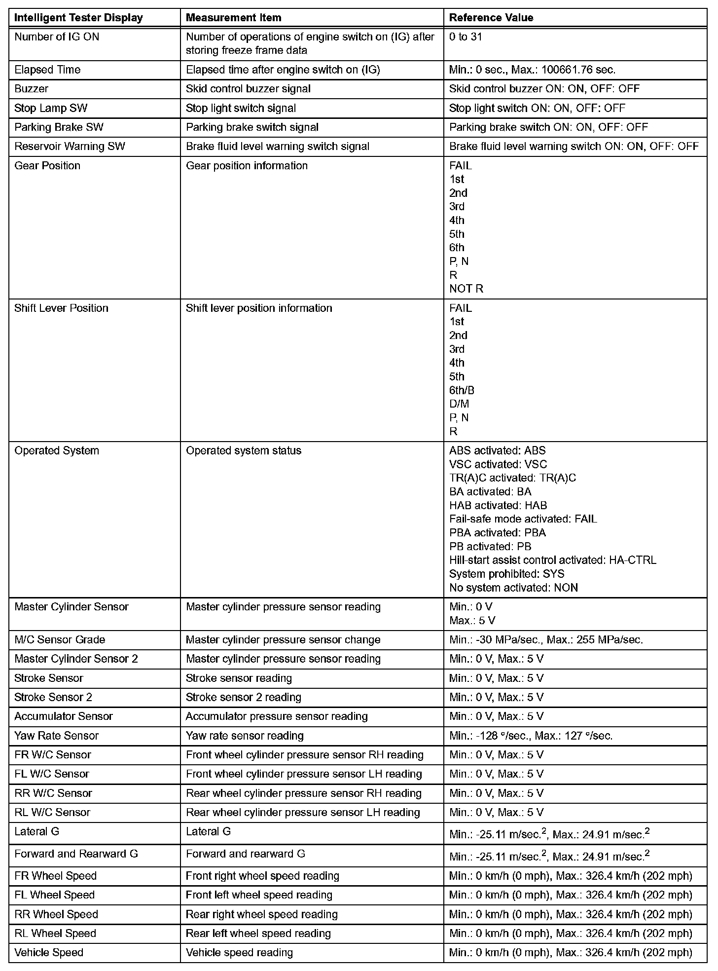 - Freeze frame data at the time the ABS, BA, TR(A)C or VSC operates: