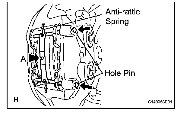 (b) While pressing the area labeled A, remove the 2 front disc brake anti-rattles with hole pins and front disc brake anti-rattle spring.