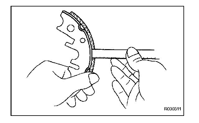 If the lining thickness is less than the minimum, or if there is severe or uneven wear, replace the brake shoe.
