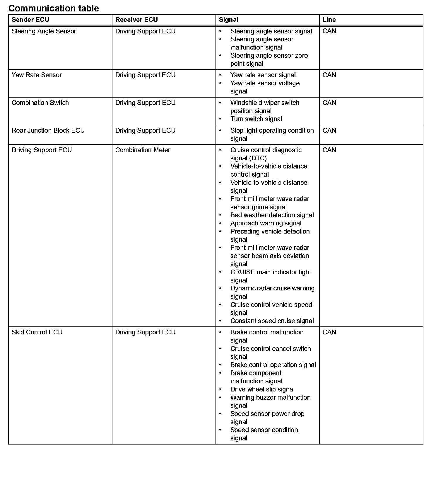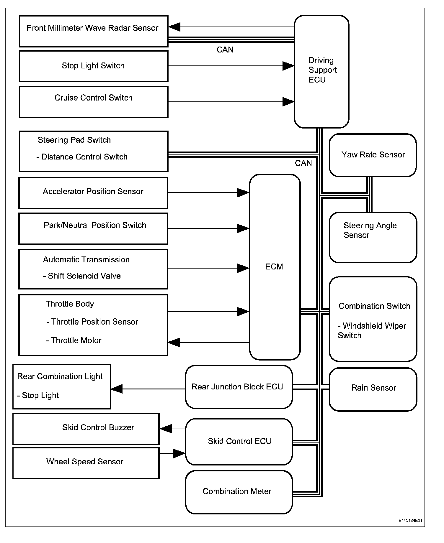 The driving support ECU determines the distance to the vehicle in front, relative speed, target decreasing speed and deceleration rate. Based on the data, the ECU may transmit a brake demand signal to the skid control ECU.