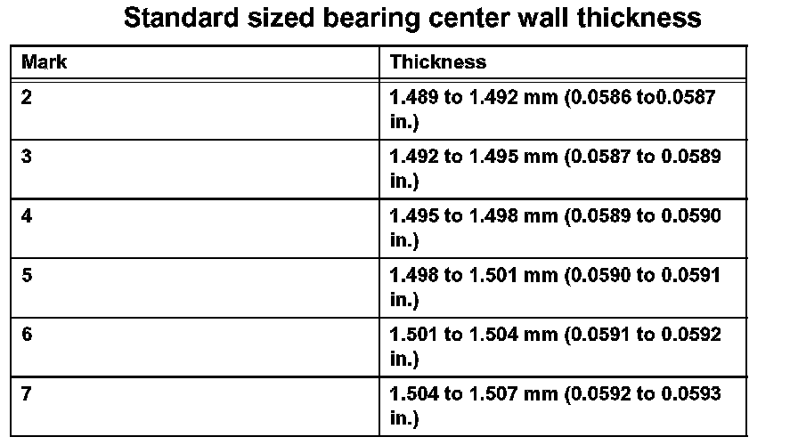 ^ If replacing a bearing, replace it with one that has the same number as its respective connecting rod cap. Each bearing's standard thickness is indicated by a 1, 2, 3 or 4 mark on its surface.