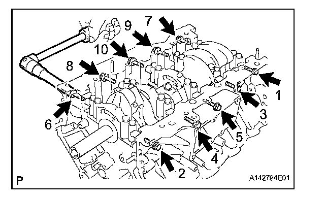 (a) Uniformly loosen and remove the 10 bearing cap bolts and 10 seal washers in several steps, in the sequence shown the illustration.