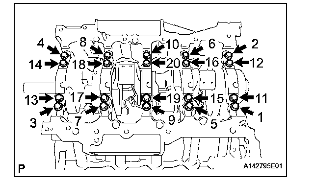 (b) Uniformly loosen the 20 bearing cap bolts in several steps, in the sequence shown in the illustration.