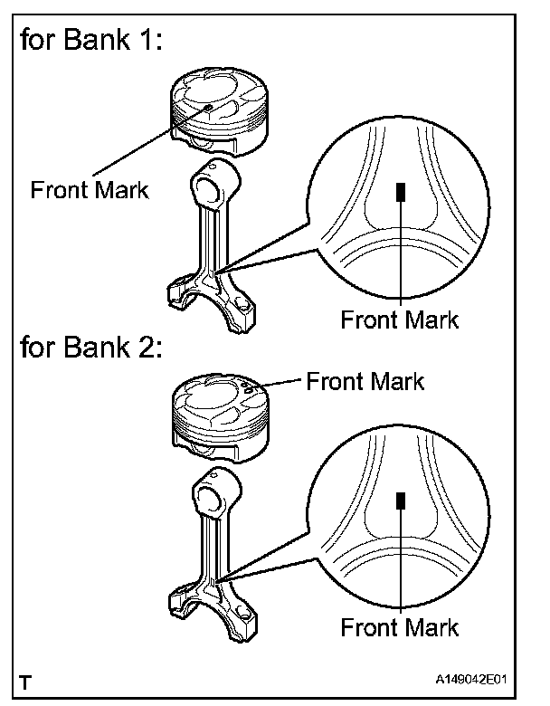 NOTICE: For bank 1, perform the assembly so that the front marks of the piston and connecting rod are on the same side. For bank 2, perform the assembly so that the front marks of the piston and connecting rod are on opposite sides.