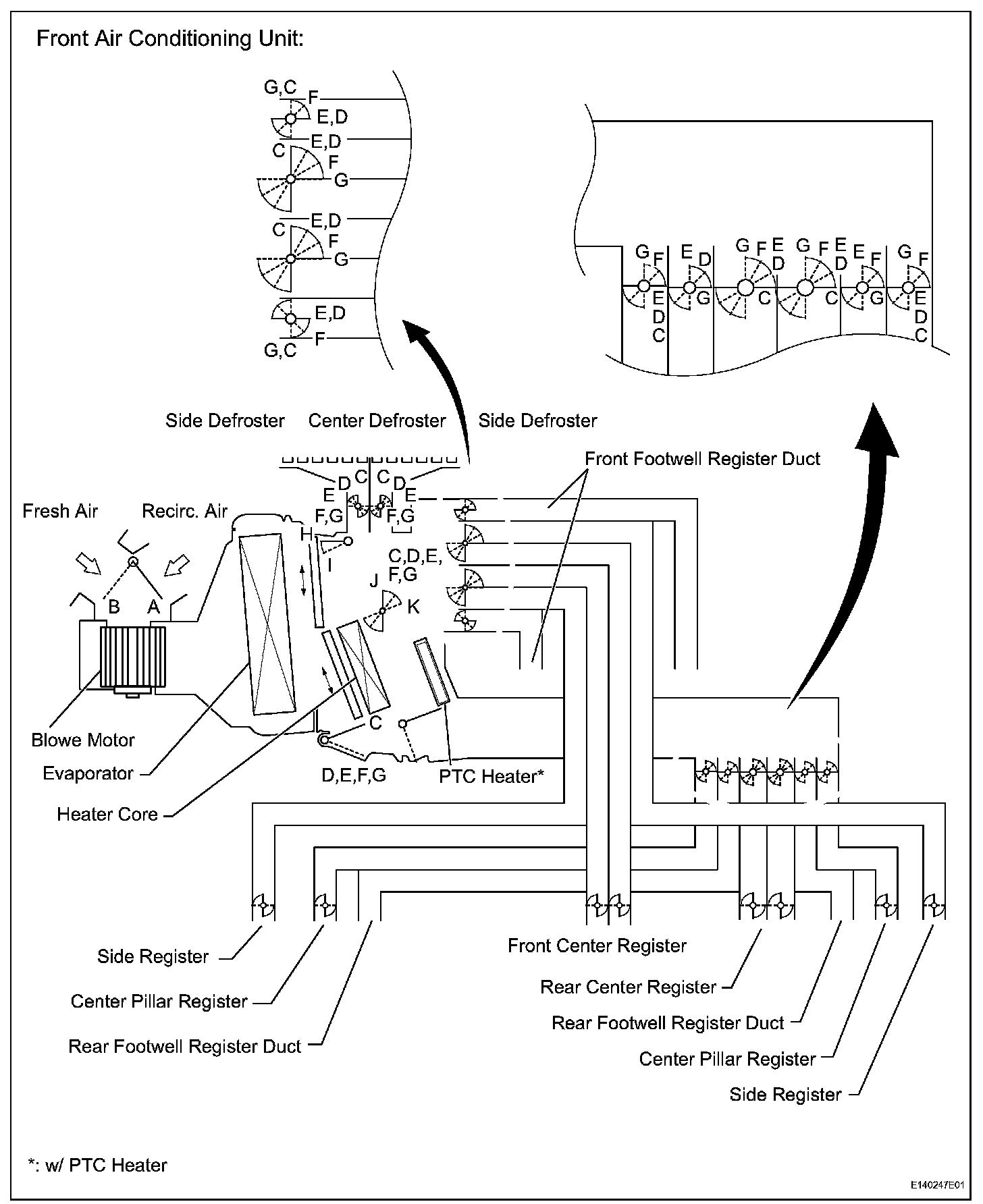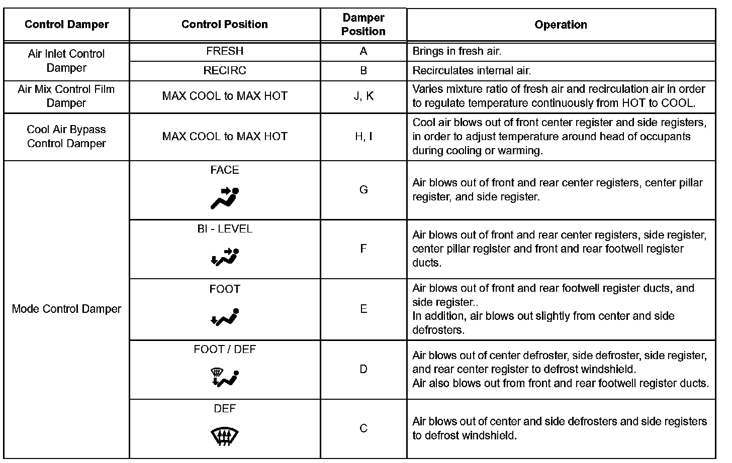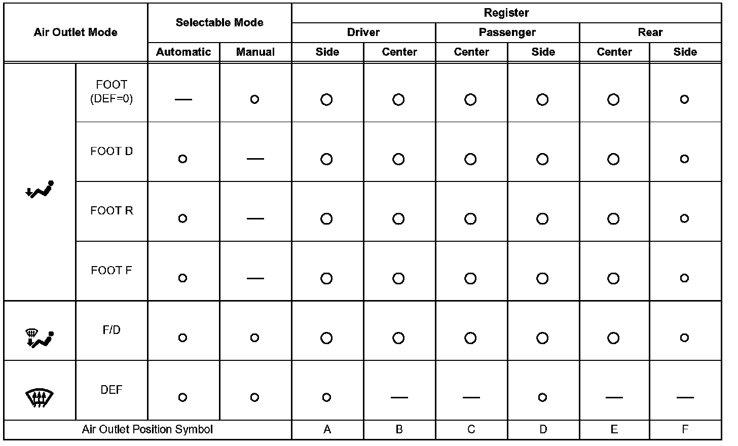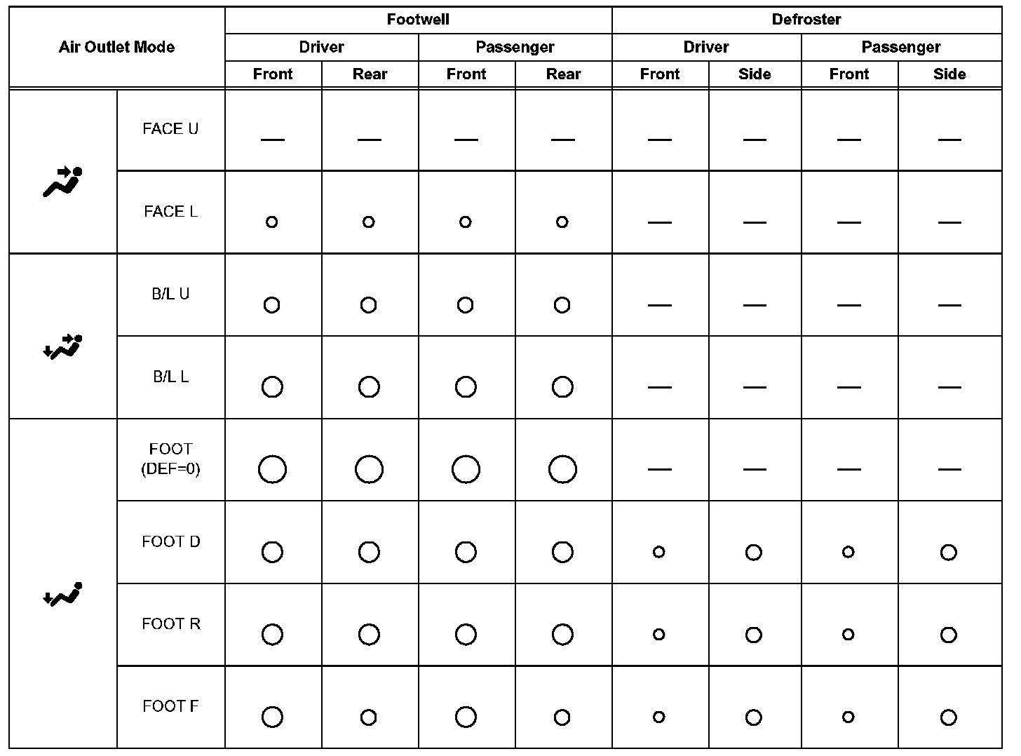 - FOOT (DEF=0): FOOT mode where no air flows from defroster