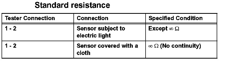 HINT: Use an incandescent lamp for inspection. Bring it within 30 cm (11.8 in.) of the A/C solar sensor. If the result is not as specified, replace the thermistor.