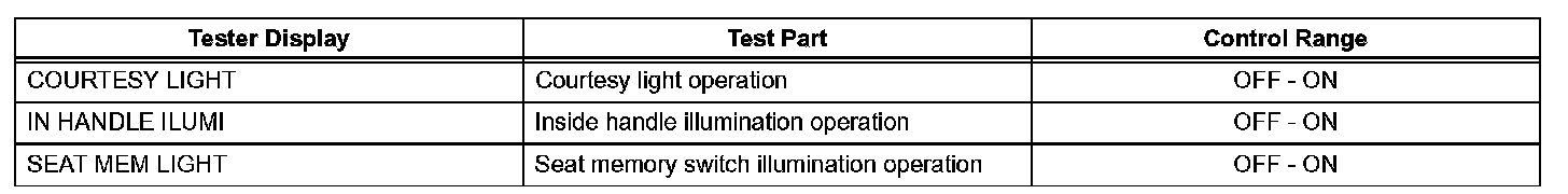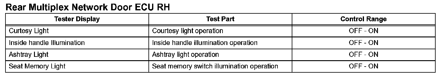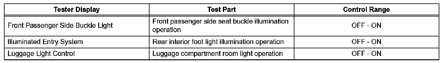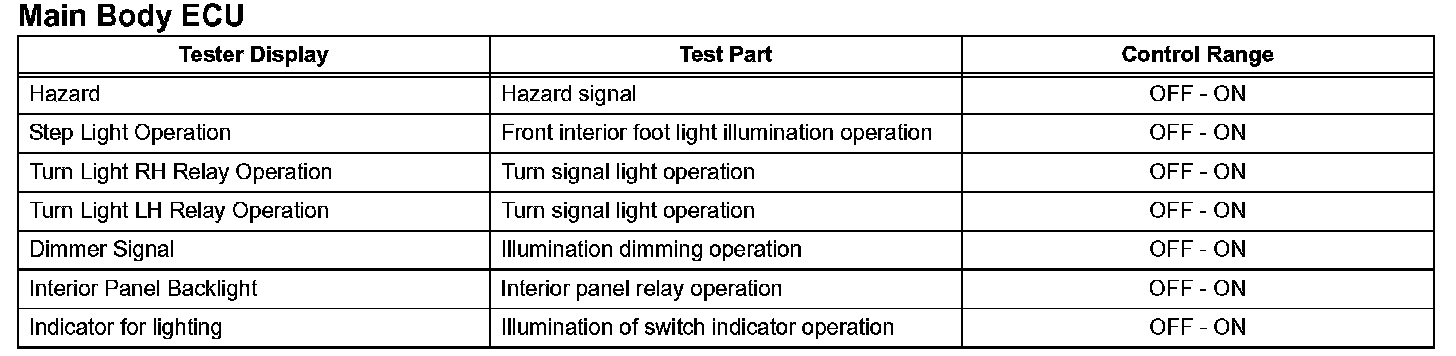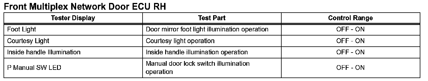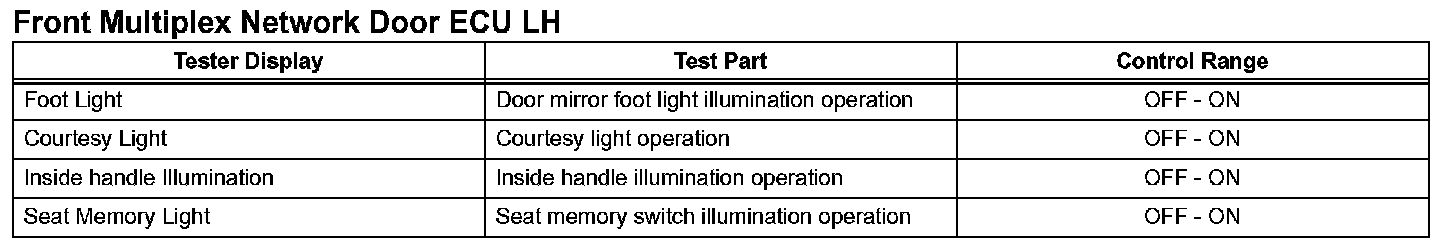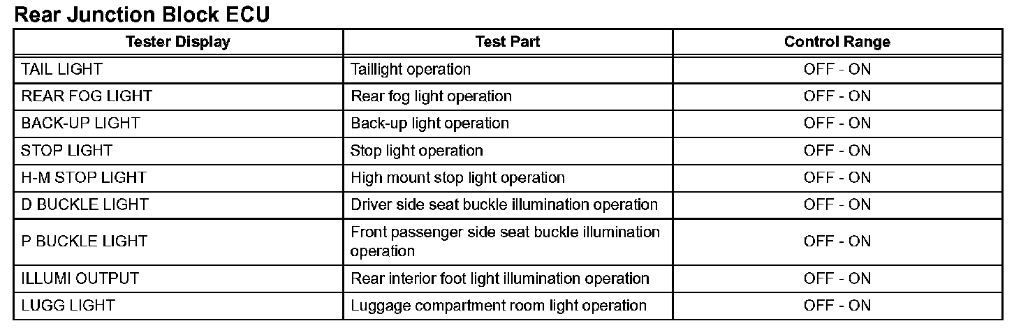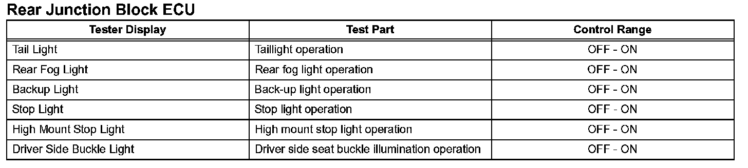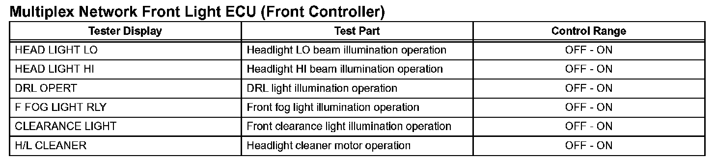 ACTIVE TESTNOTE: When a Rear Junction Block ECU and Multiplex Network Front Light ECU (Front Controller) related vehicle switch is ON, Active Test items related to the vehicle switch are prohibited (double operation prohibition). Check that the vehicle switches are OFF before performing Active Tests.