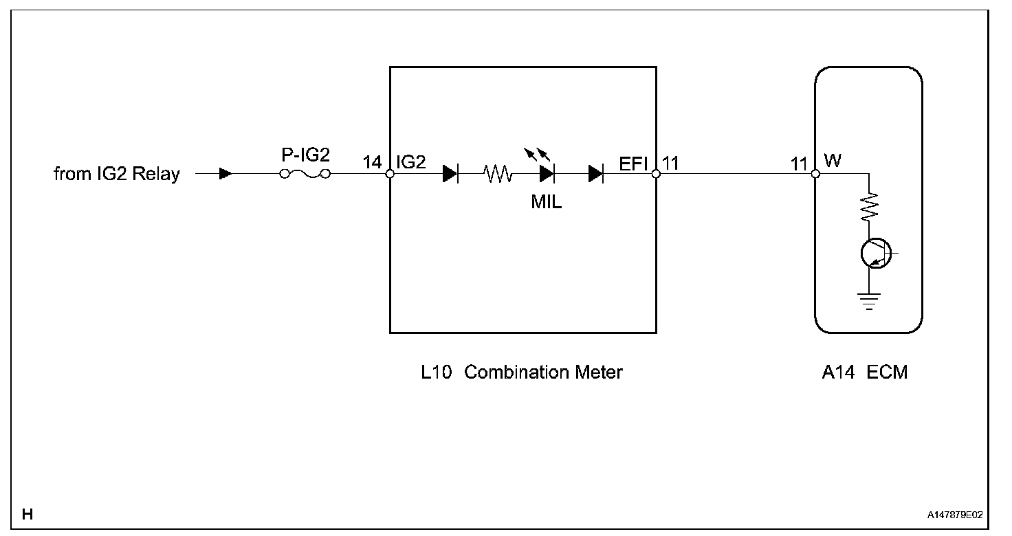 The MIL (Malfunction Indicator Lamp) is used to indicate vehicle malfunction detections by the ECM. By turning the engine switch on (IG), power is supplied to the MIL circuit, and the ECM provides the circuit ground which illuminates the MIL.