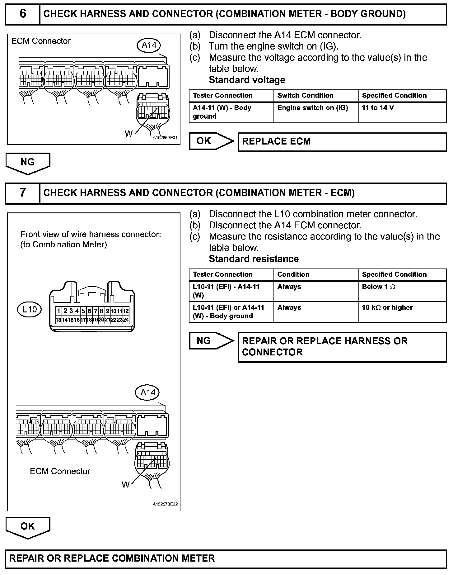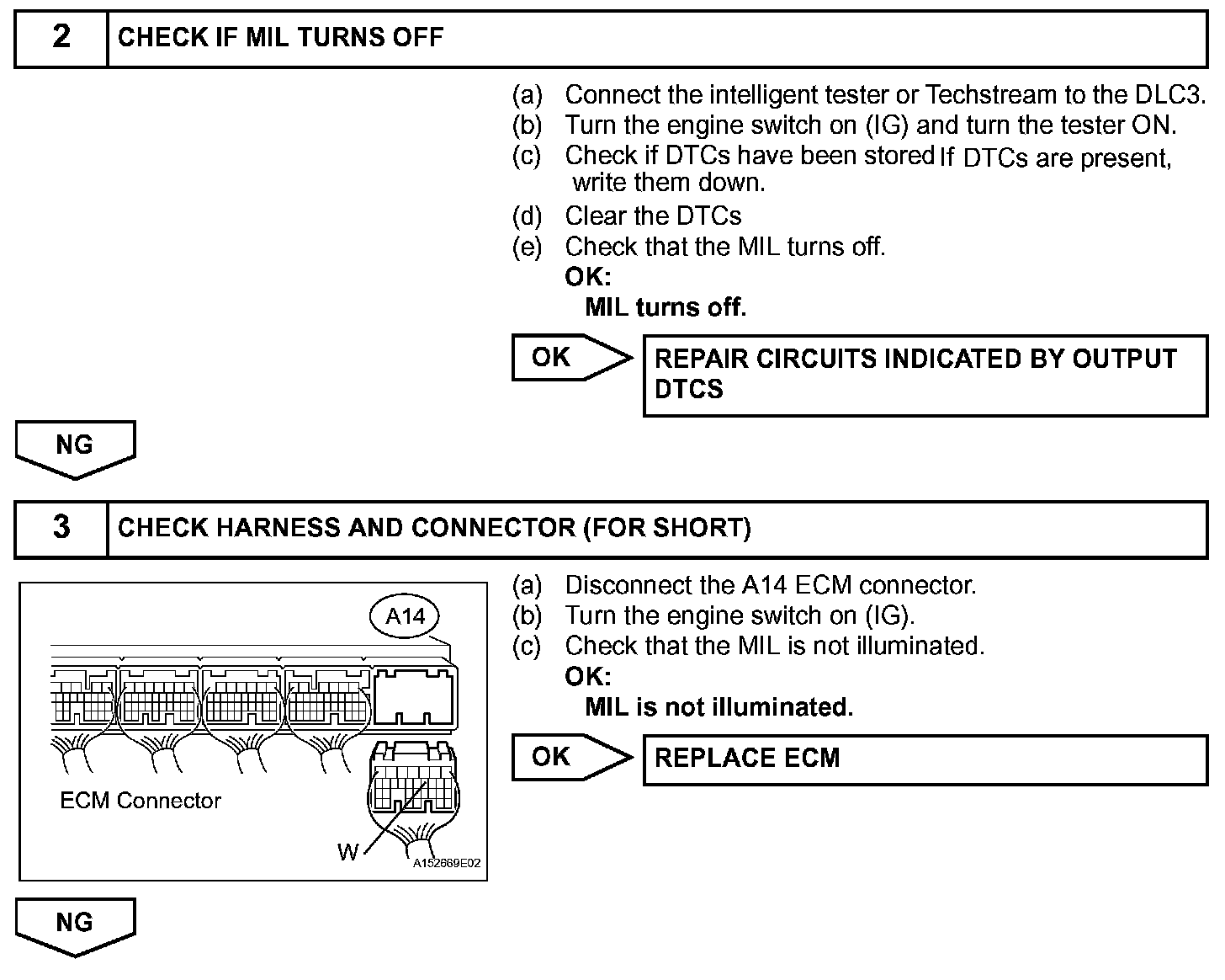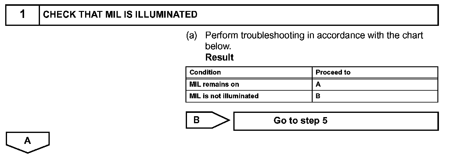 When the engine switch is first turned on (IG), the MIL should be illuminated and should then turn off. If the MIL remains illuminated or is not illuminated, conduct the following troubleshooting procedure. If the ECM detects trouble, the MIL illuminates. At this time, the ECM records a DTC in the memory.