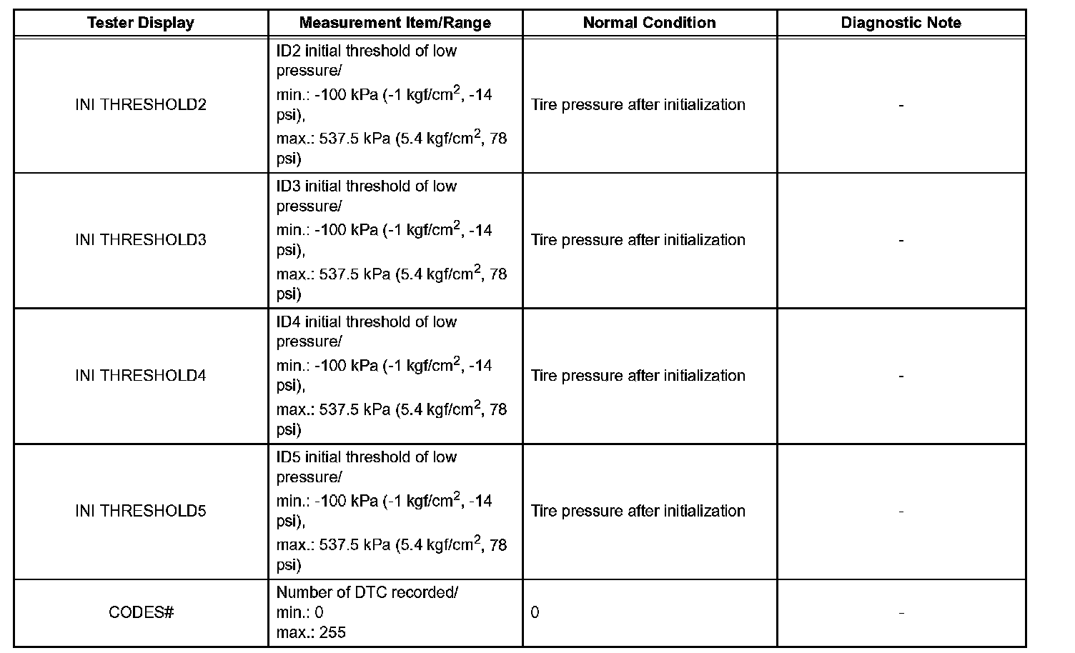 NOTICE: In the table, the values listed under "Normal Condition" are reference values. Do not depend solely on these reference values when deciding whether a part is faulty or not.