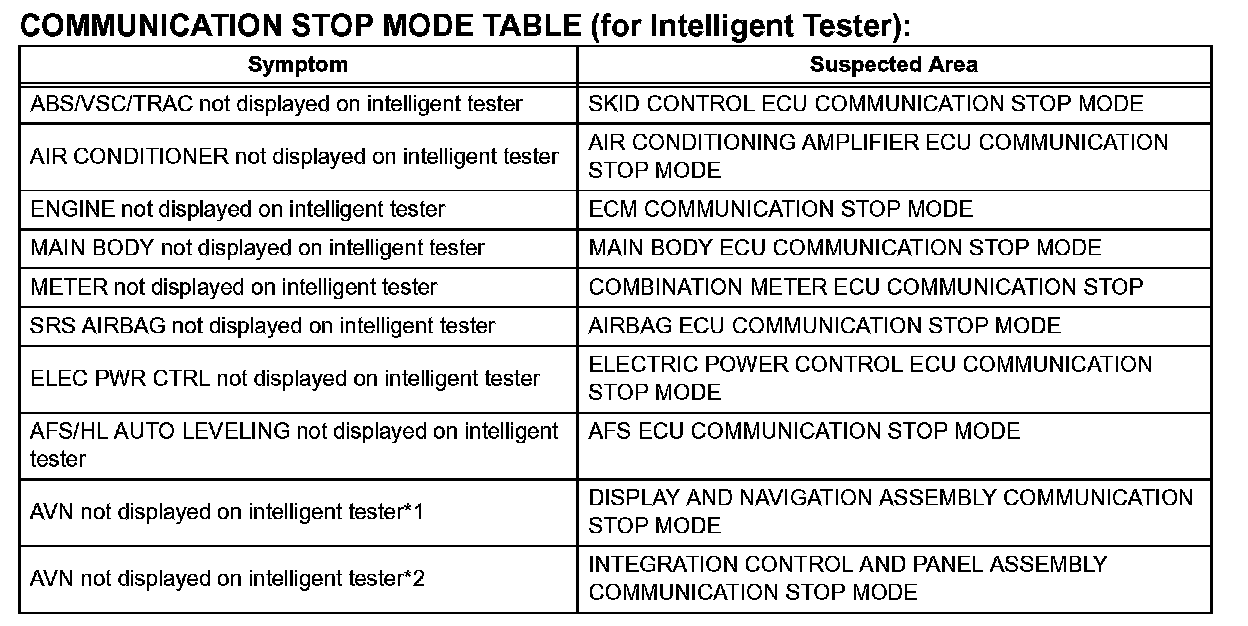Problem Symptoms Table-Communication Stop Mode Table (For Techstream):
