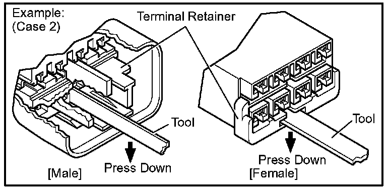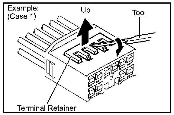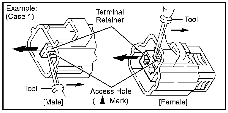 Insert the special tool into the terminal retainer access hole ( Mark) and pull the terminal retainer up to the temporary lock position.