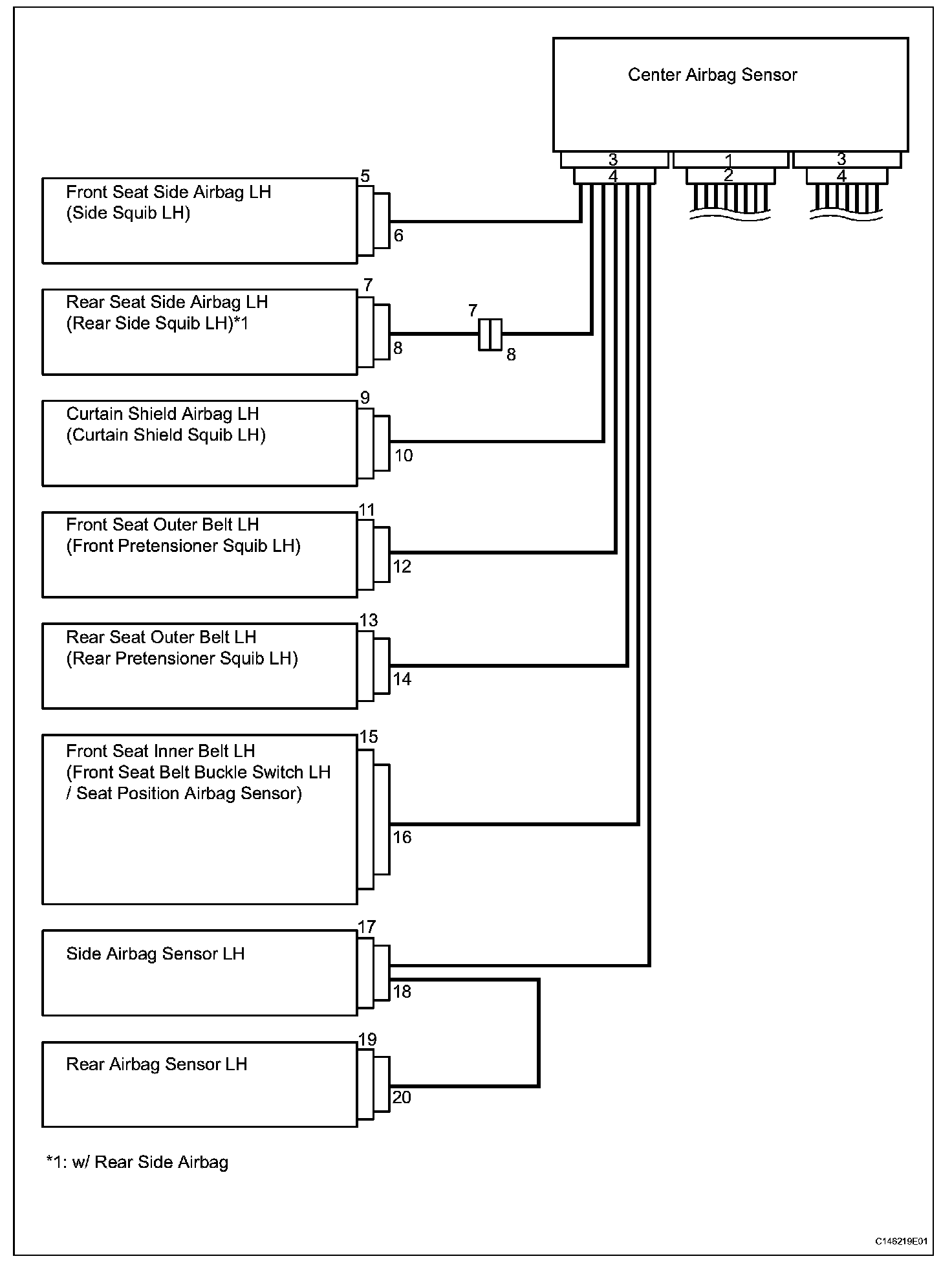 HINT: In the airbag system, the center airbag sensor, front airbag sensor LH and RH, side airbag sensor LH and RH, rear airbag sensor LH and RH are collectively referred to as the airbag sensors.