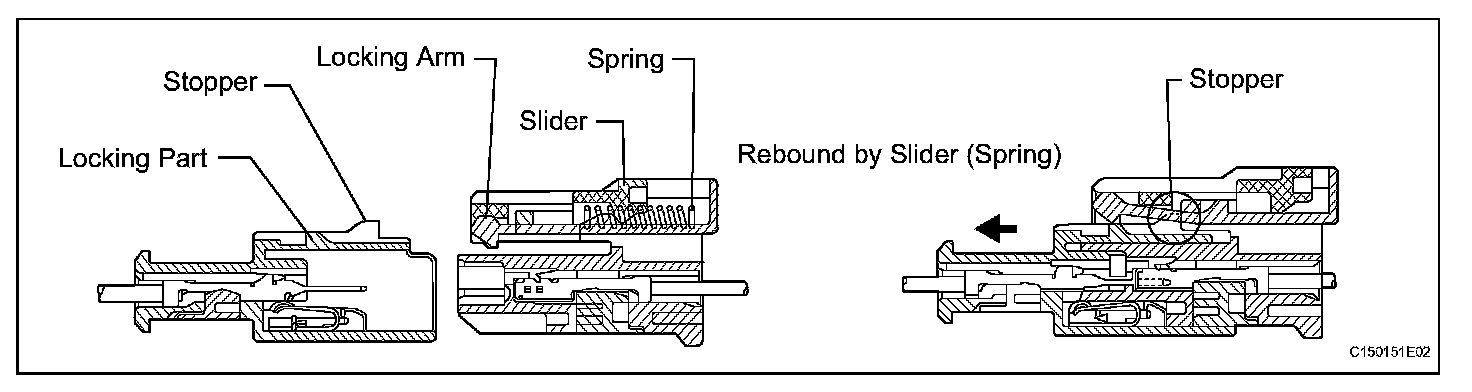 All connectors with an activation prevention mechanism contain a short spring plate. When these connectors are disconnected, the short spring plate creates a short circuit by automatically connecting the positive (+) and negative (-) terminals of the squib.