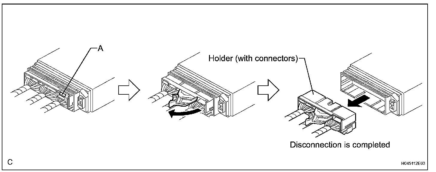 a. Pull the lever by pushing part A as shown in the illustration and disconnect the holder (with connectors).