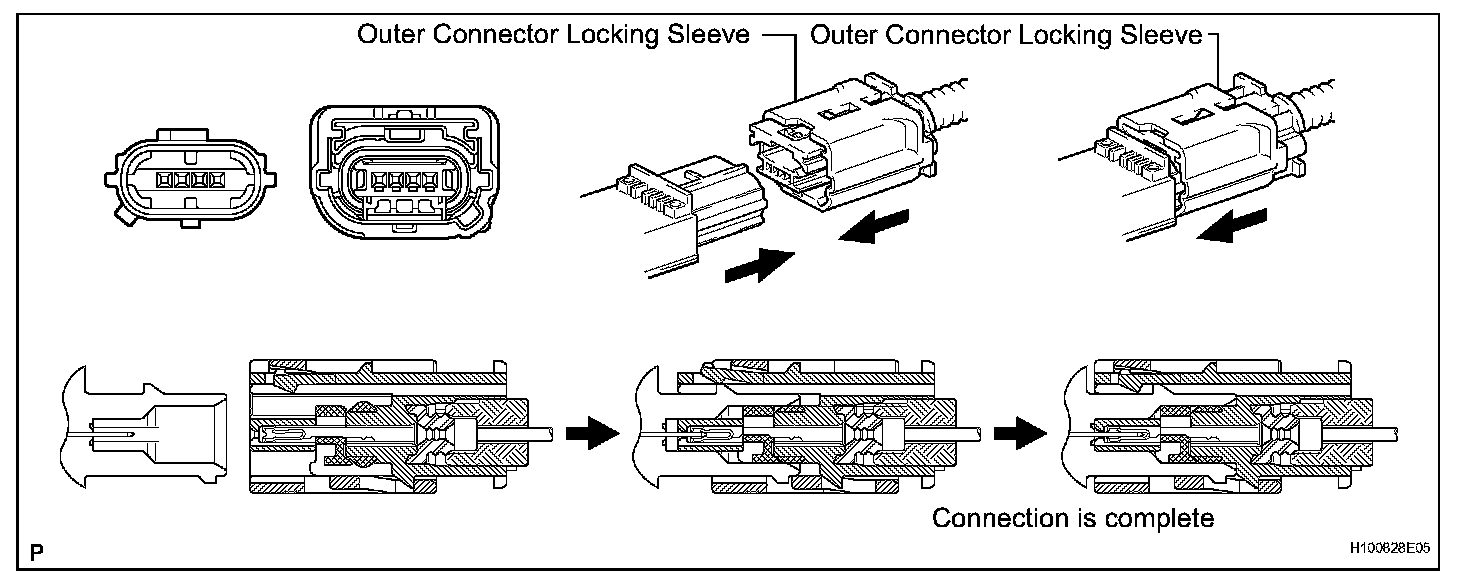a. Connect the connector as shown in the illustration (When locking, make sure that the outer connector locking sleeve returns to its original position and a click sound can be heard).