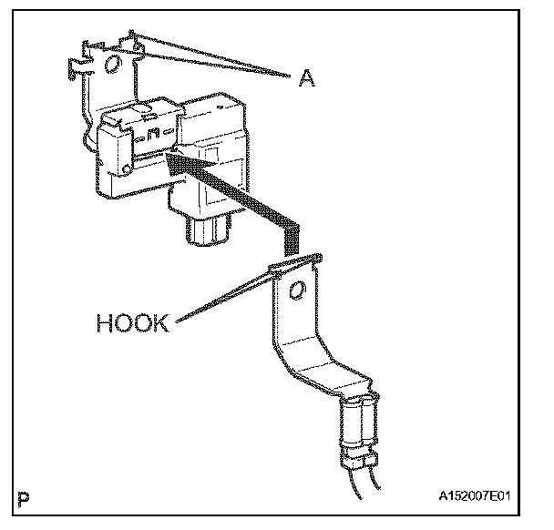b. Hook the bracket onto the hole on the engine room body, and install the battery current sensor assembly with the bolt.