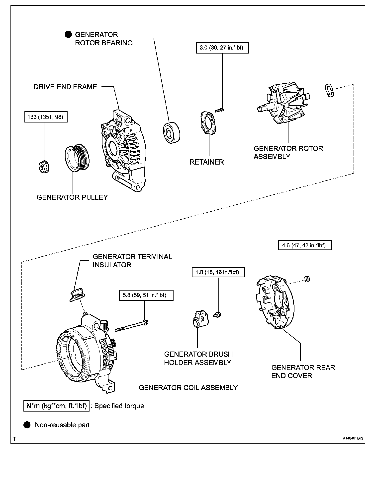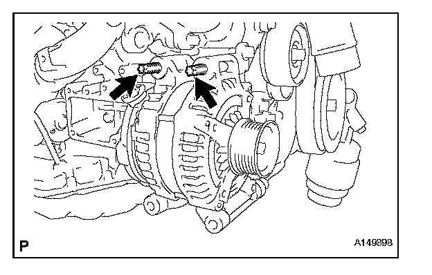 d. Using an E8 "TORX" socket wrench, remove the 2 stud bolts and generator.