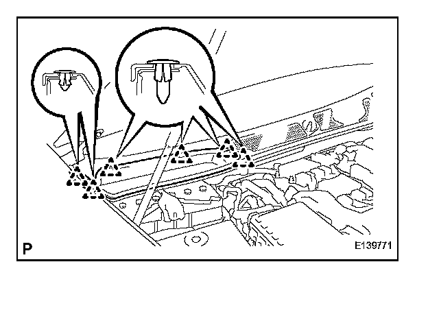 NOTE: If the cowl top ventilator louver RH is not properly installed, water may leak into the engine room and cause malfunctions. Therefore, make sure the cowl top ventilator louver RH is installed properly.