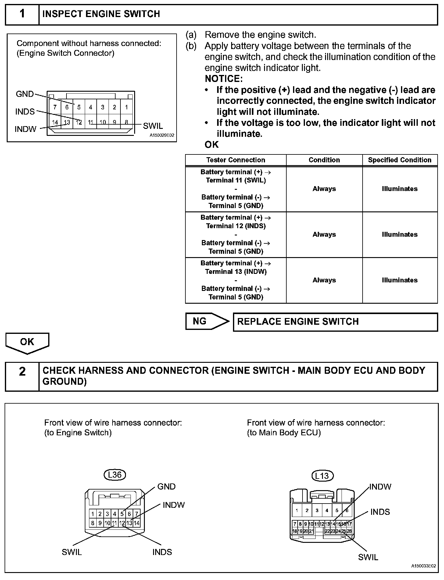 Engine start conditions or system malfunctions can be checked by observing the status of the engine switch indicator light.