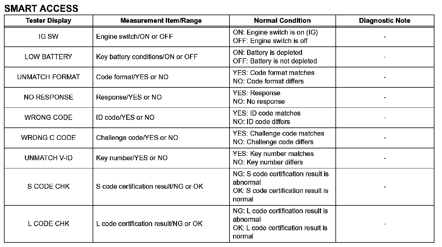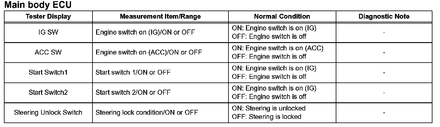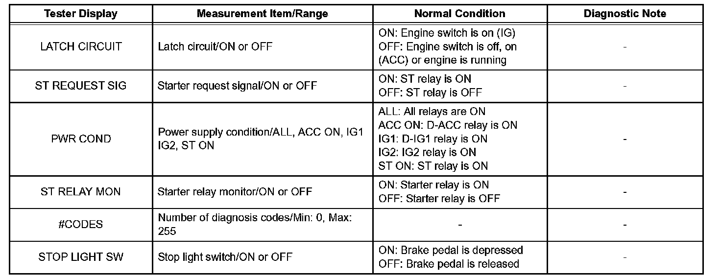 READ DATA LISTHINT: Using the intelligent tester or Techstream to read the Data List allows the values or states of switches, sensors, actuators and other items to be read without removing any parts. This non-intrusive inspection can be very useful because intermittent conditions or signals may be discovered before parts or wiring is disturbed. Reading the Data List information early in troubleshooting is one way to save diagnostic time.