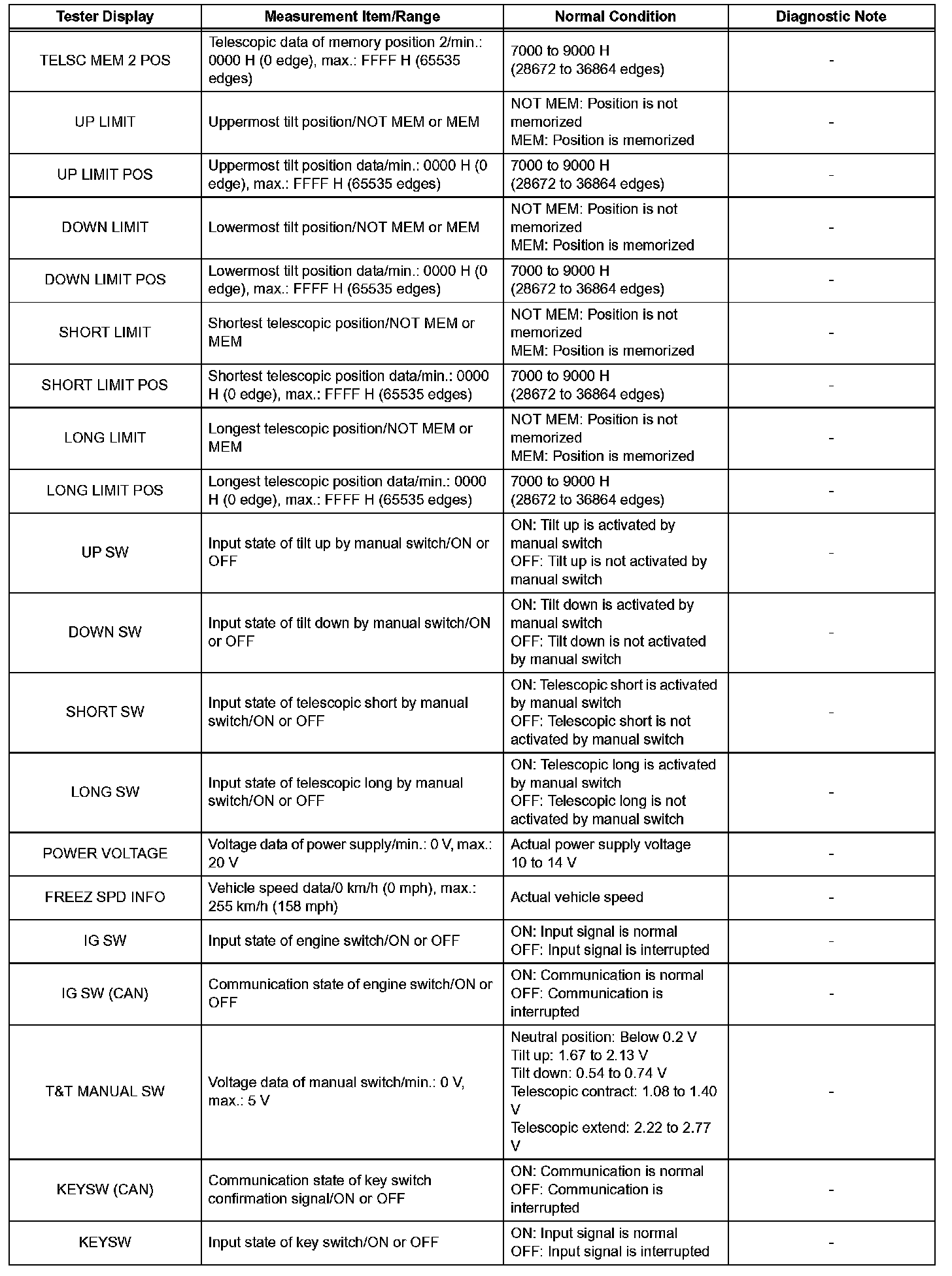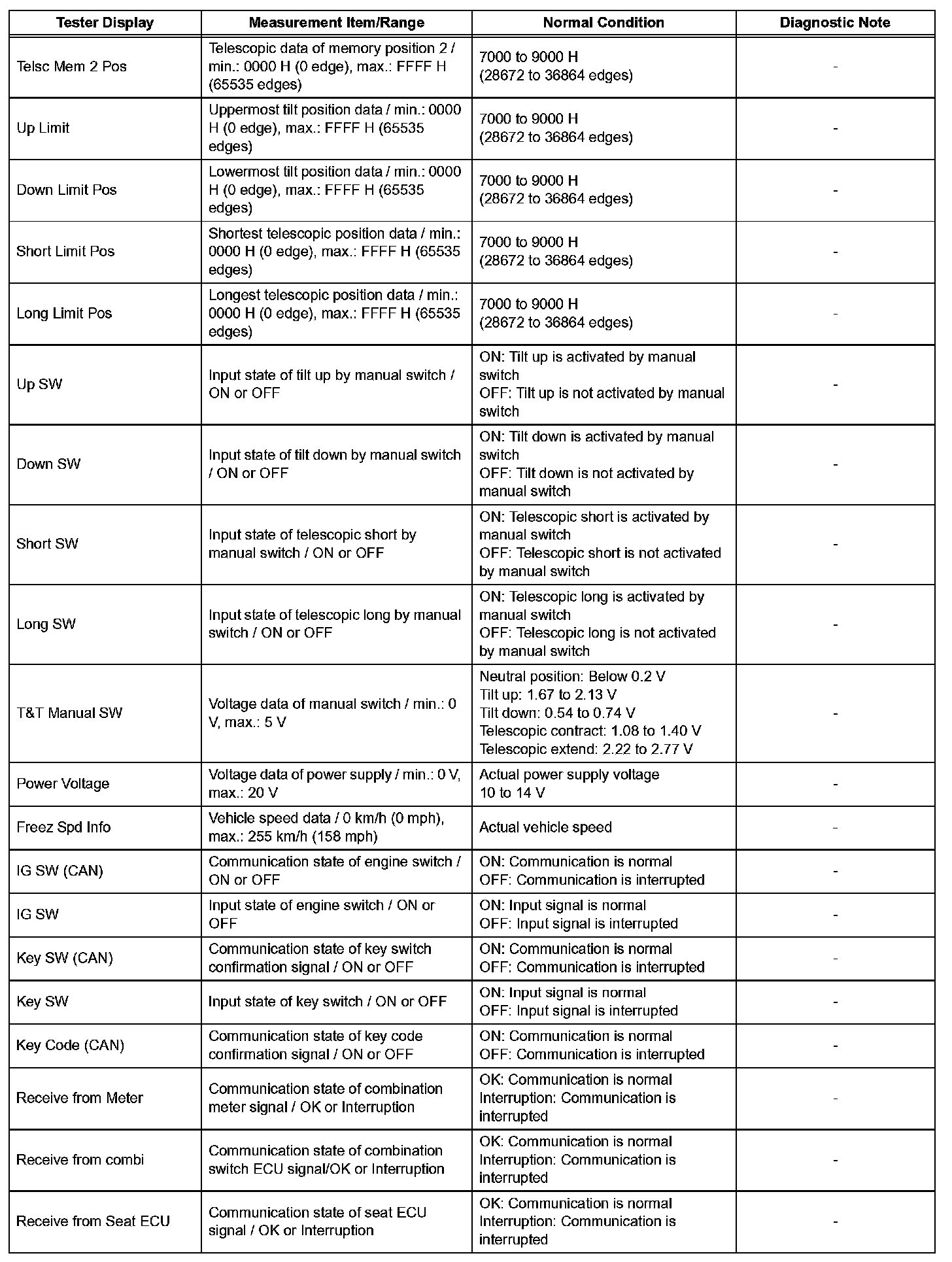NOTICE: In the table, the values listed under "Normal Condition" are reference values. Do not depend solely on these reference values when deciding whether a part is faulty or not.