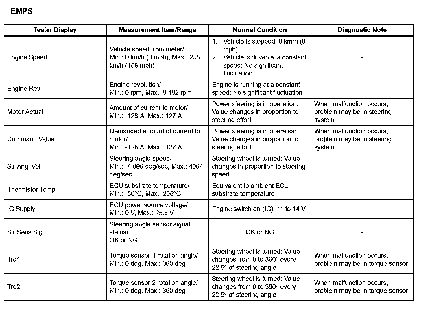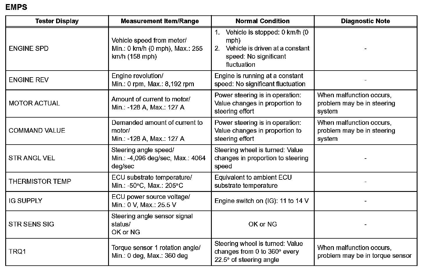 ^ With the vehicle stopped or driving very slowly, if the steering wheel is turned repeatedly or turned to a lock position and driven for an extended period of time, the power assistance amount is decreased to prevent overheating of the motor and ECU. If this occurs, idle the engine and do not turn the steering wheel for approximately 10 minutes to return the power assistance to normal.