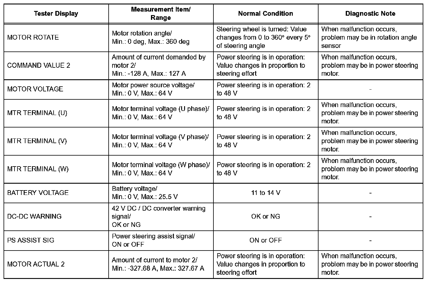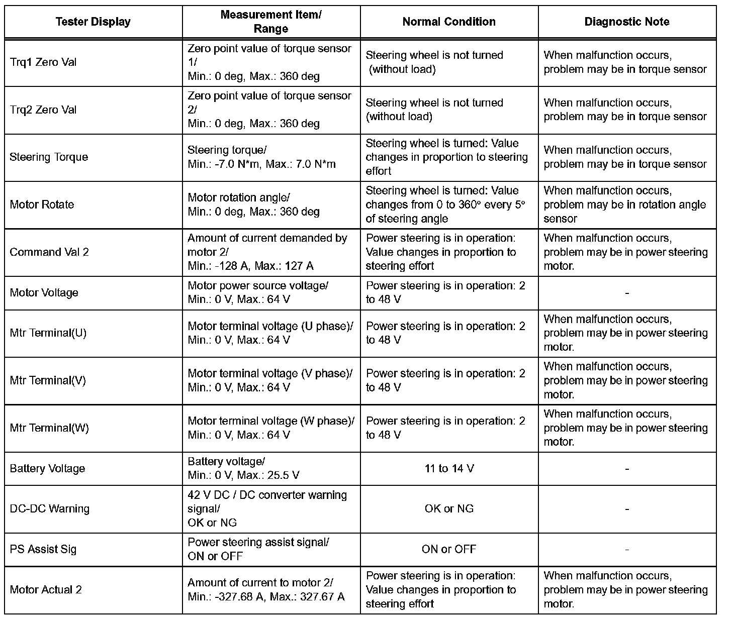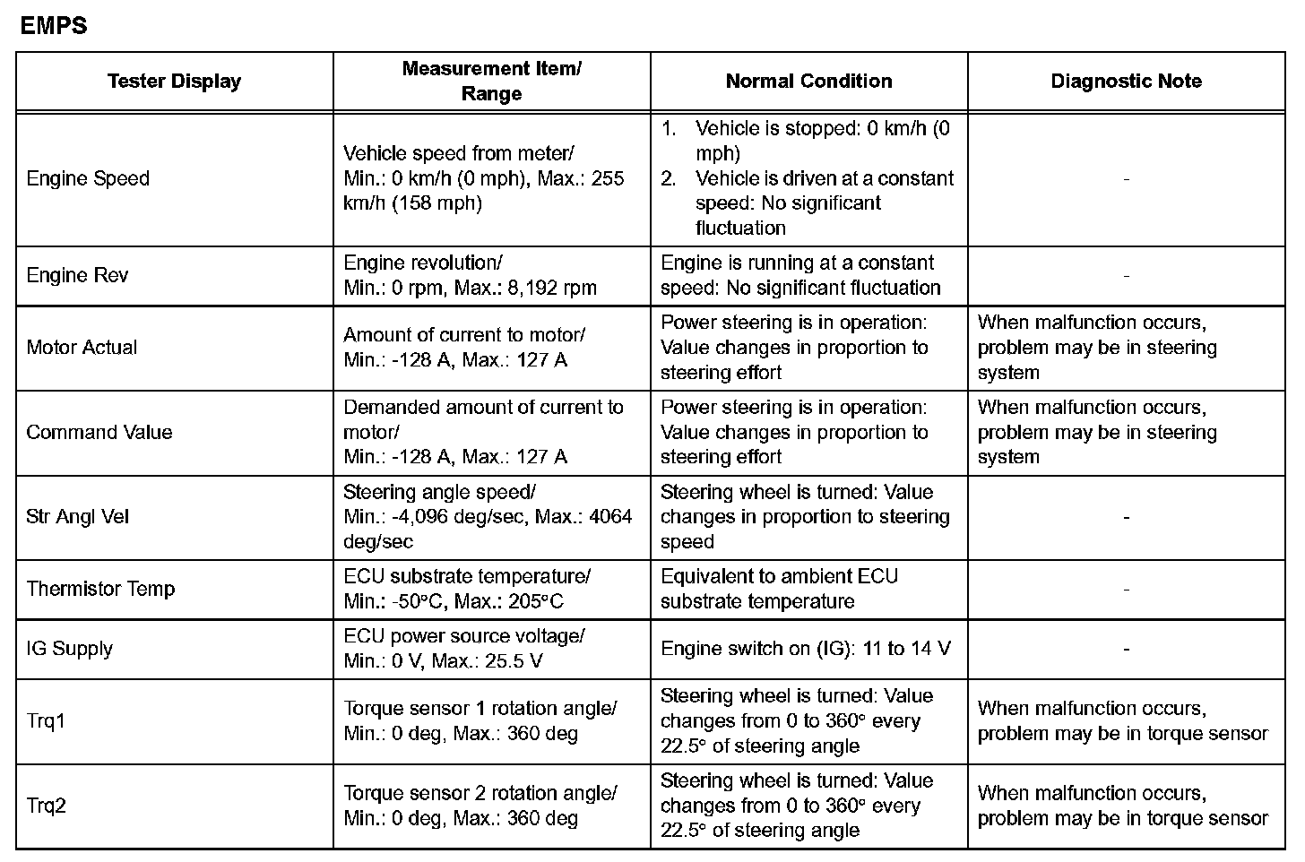 ^ It is difficult to show the specified values (judgment values) clearly because freeze frame data values change significantly due to differences in measurement conditions, surroundings, or vehicle conditions. For this reason, there may be a problem even when the values are within specifications.