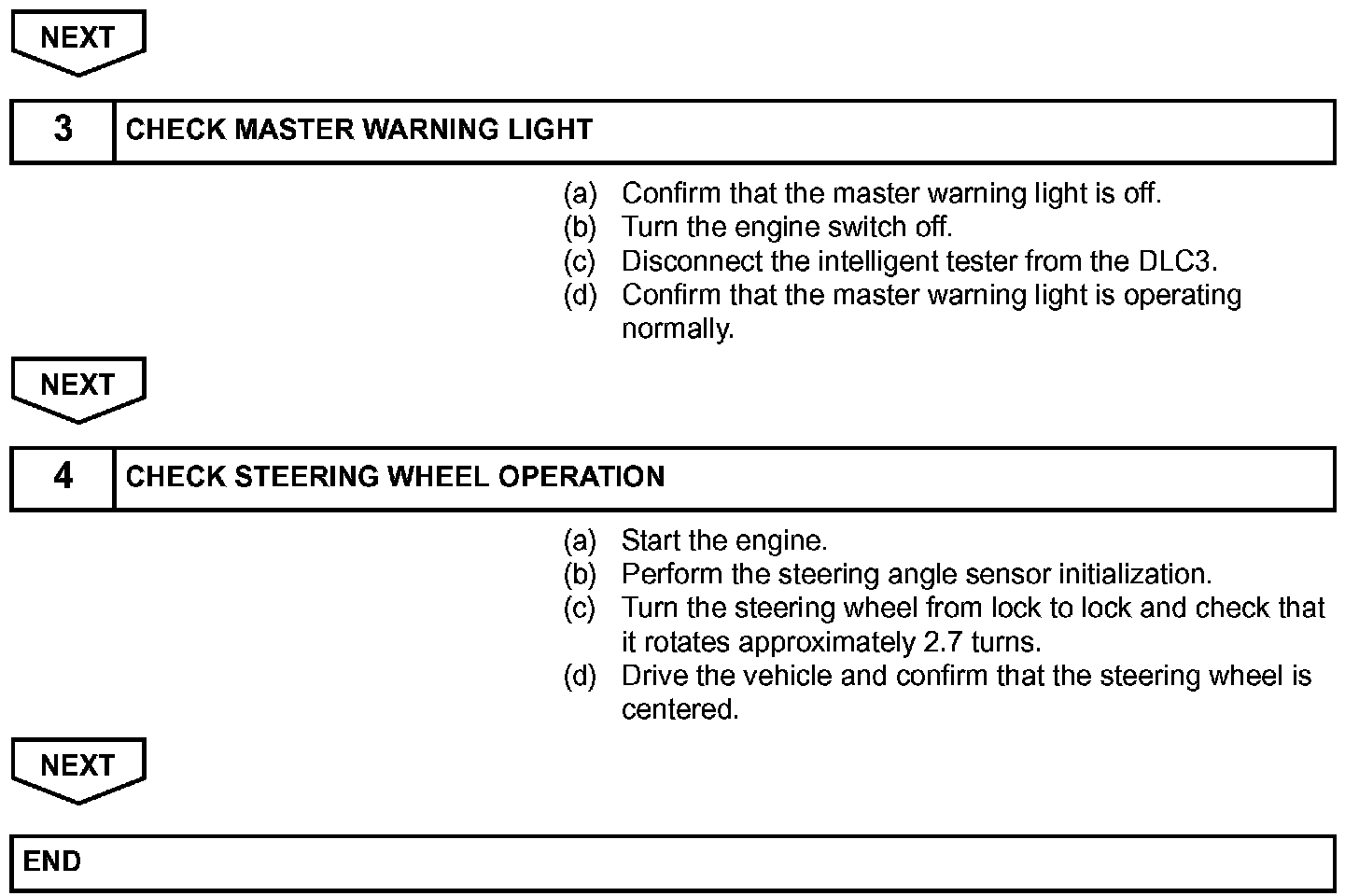 NOTE: If the steering wheel turns approximately 3.2 turns, drive the vehicle on a straight road at 35 km/h (22 mph) or more for 5 seconds or longer. Then confirm the initialization again.
