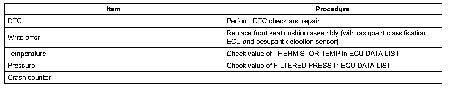HINT: If the ECU data cannot be stored in the intelligent tester or Techstream, replace the front seat cushion (with occupant classification ECU and occupant detection sensor).