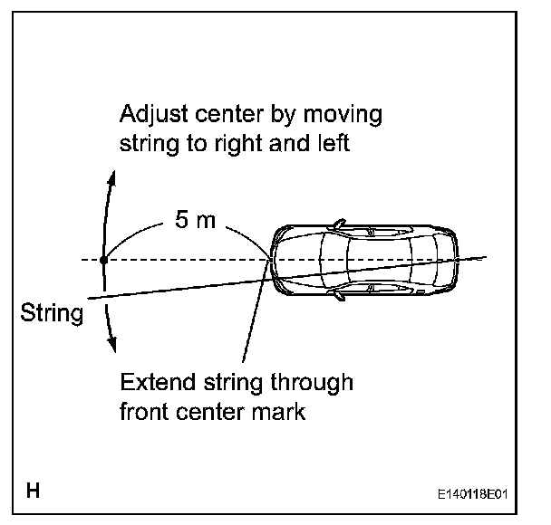 2. Set one end of the 10 m (32.82 ft.) string on the vehicle rear's center point. Run the string over the vehicle front's center point to a position 5 m (16.41 ft.) beyond the vehicle front's center point, as shown in the illustration. Mark the 5 m (16.41 ft.) position.