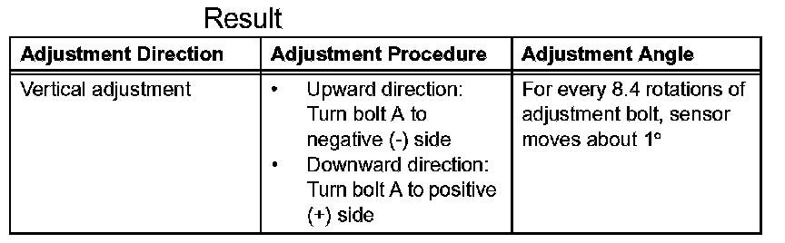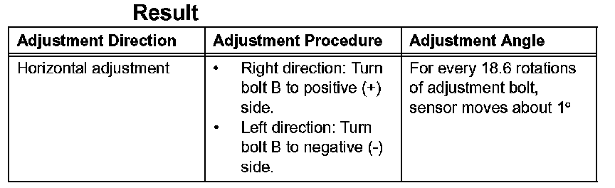 - If "LEFT SIDE: 1.0°" is displayed, the divergence is 1.0° in the left direction. Turn bolt B approximately 18.6 turns to the negative (-) side.