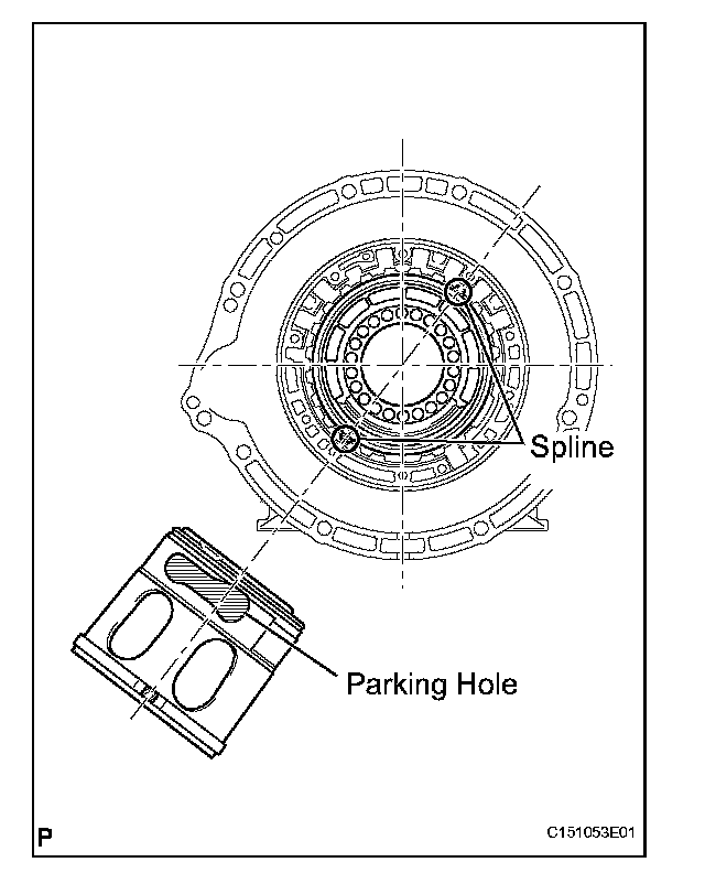 HINT: Make sure that the parking hole of the brake piston is on the bottom side by engaging the brake piston's 2 protrusions to the transmission case's spline grooves. (One groove is 3 places clockwise from the top, and the other is 2 places clockwise from the bottom).