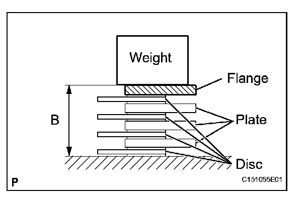 (b) Assemble the 4 No. 2 brakes discs, 3 No. 2 brake plates, and No. 2 brake flange as shown in the illustration. Then with a weight fixture of 500 g (17.64 oz) or less placed on the flange, measure length B. *2