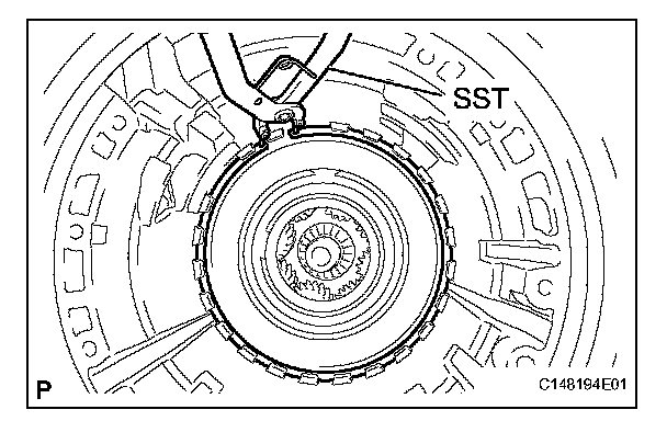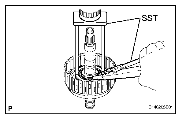 (b) Using SST, install the snap ring to the transmission case.