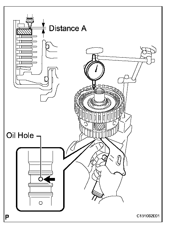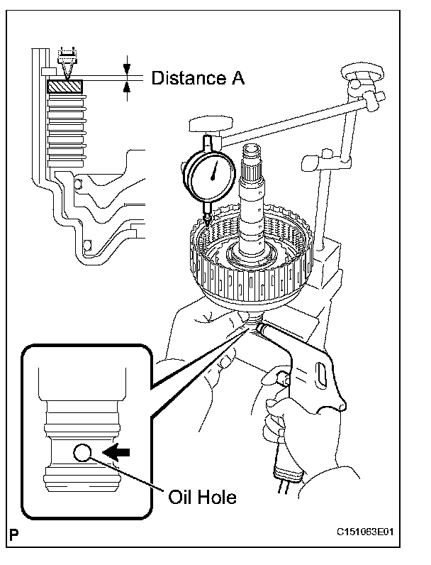 (d) Using a dial indicator, measure the moving distance (distance A) of the clutch flange at both ends across the diameter while blowing compressed air (196 kPa, 2.0 kgf*cm, 28 psi) from the oil hole as shown in the illustration. Then choose from the 9 flange thicknesses in the table so that the measured value is within the standard value.