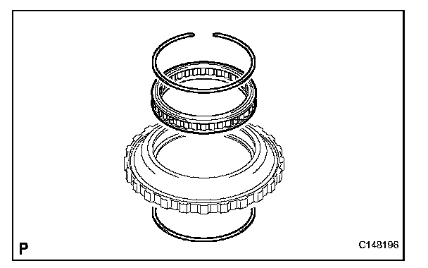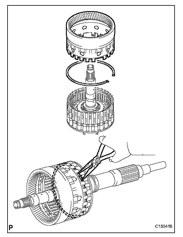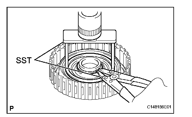 (b) Using needle-nose pliers, attach the snap ring to install the ring gear to the forward multiple disc clutch assembly.