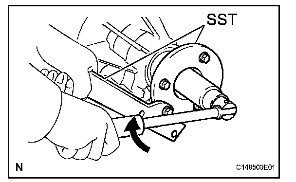 (b) Using SST and a hammer, tap in the oil seal until it fits with the transmission case.