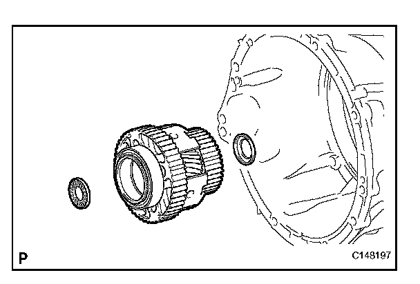 ^ Install the snap ring so that its tapered face is facing the front side of the transmission case.