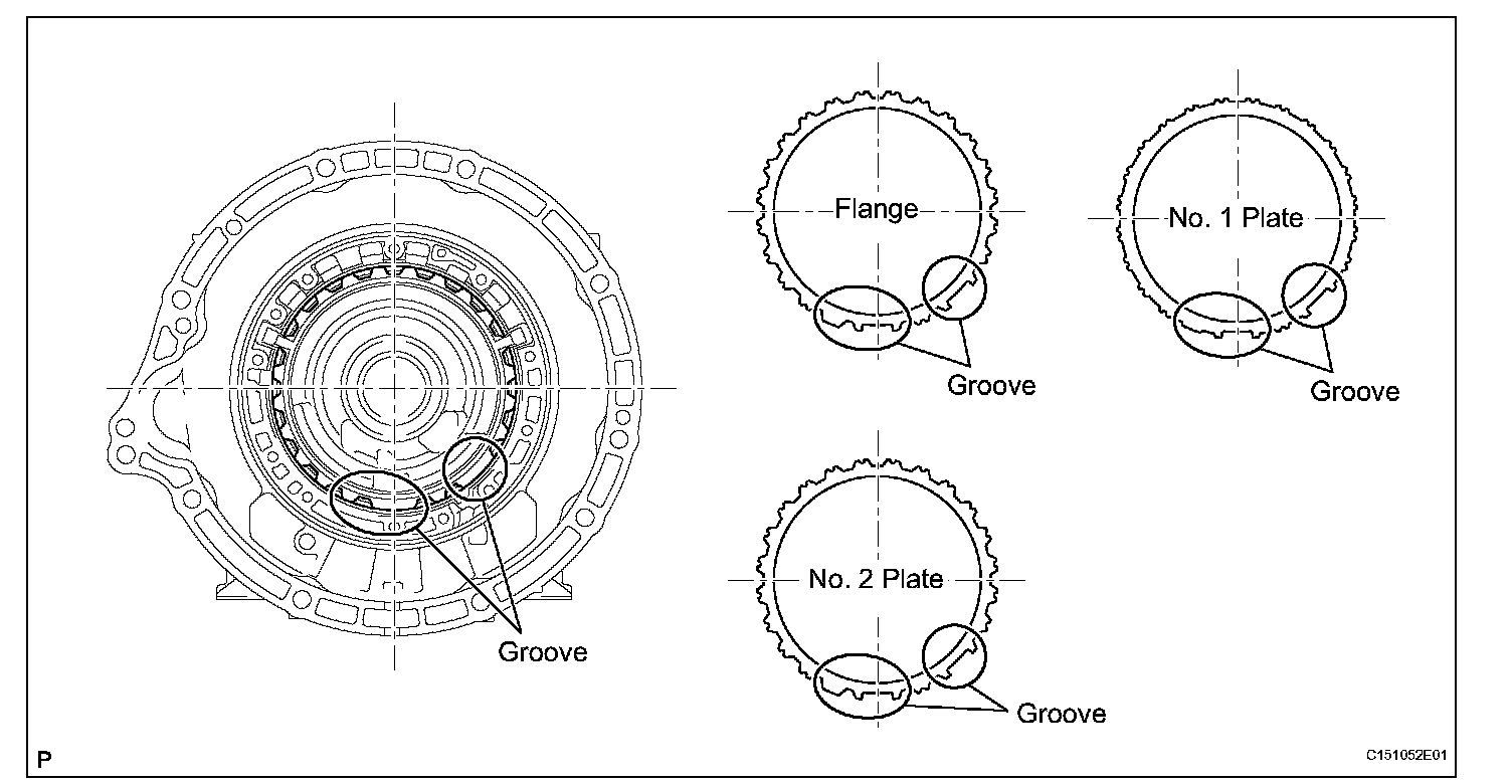 ^ Assemble the transmission case, flanges and plates by aligning their grooves as shown in the illustration.