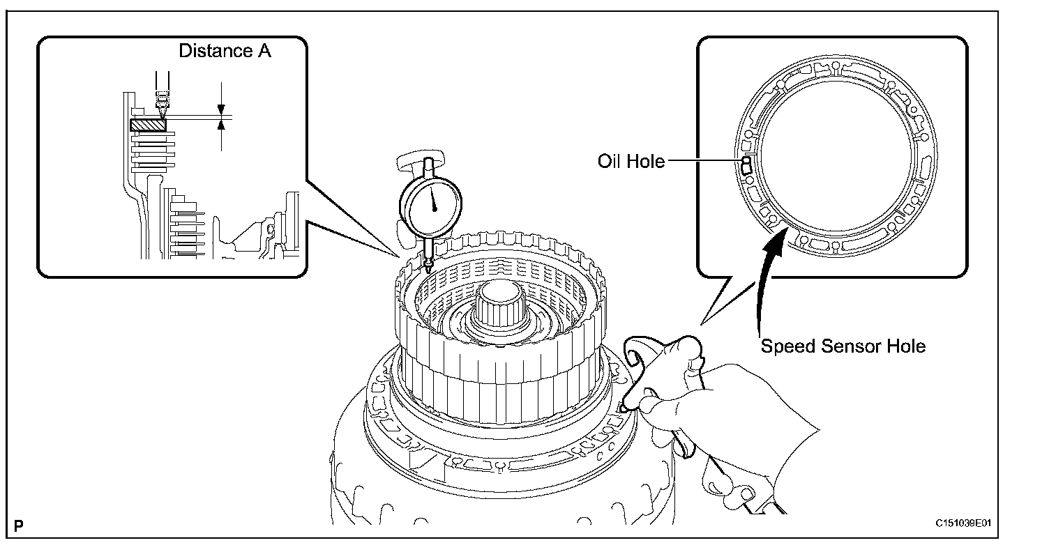 (d) Using a dial indicator, measure the moving distance (distance A) of the clutch flange at both ends across the diameter while blowing compressed air (196 kPa, 2.0 kgf*cm, 28 psi) from the oil hole as shown in the illustration. Then choose from the 9 flange thicknesses in the table so that the measured value is within the standard value.