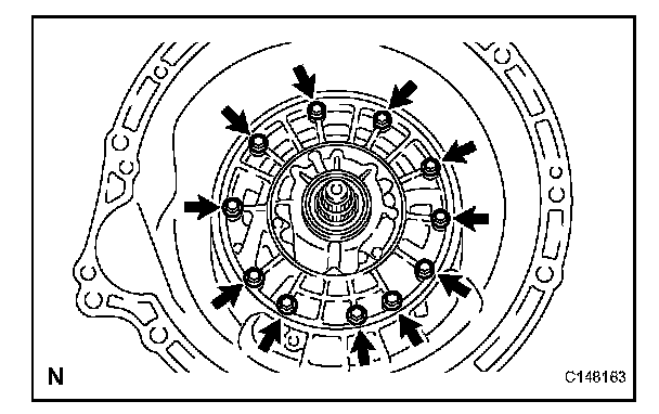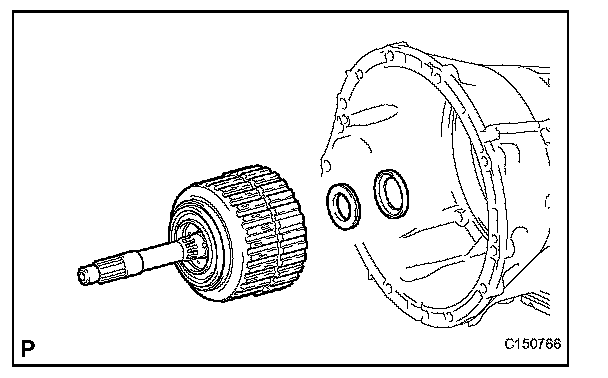 (c) Hold the input shaft, and lightly press the oil pump body to slide the oil seal rings into the No. 3 clutch drum.
