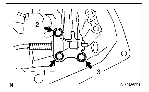 (a) Place the parking lock pawl bracket onto the transmission case. Loosely install the 3 bolts, and then tighten them in the order shown in the illustration.