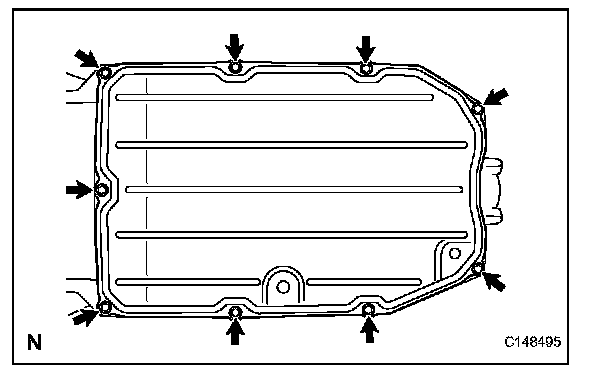(b) Install a new gasket and the oil pan to the transmission case with the 9 bolts.