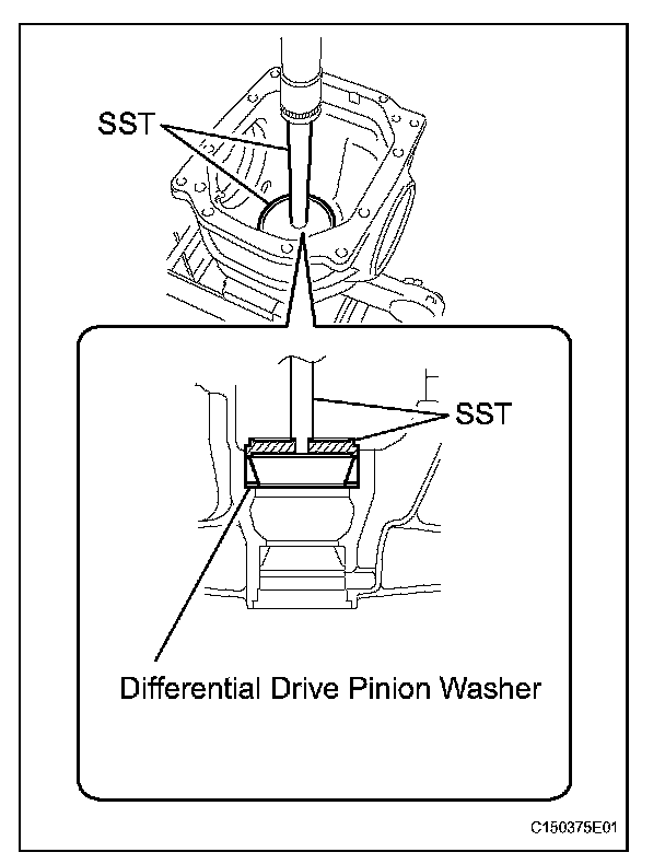 (b) Using SST and a press, press in the rear drive pinion rear tapered roller bearing outer race and drive pinion washer.