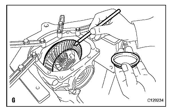 (a) Raise the ring gear side of the differential case slightly and remove the ring gear tooth side case bearing outer race.
