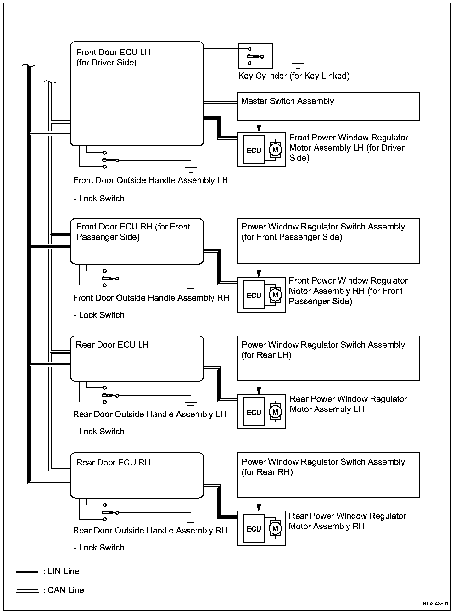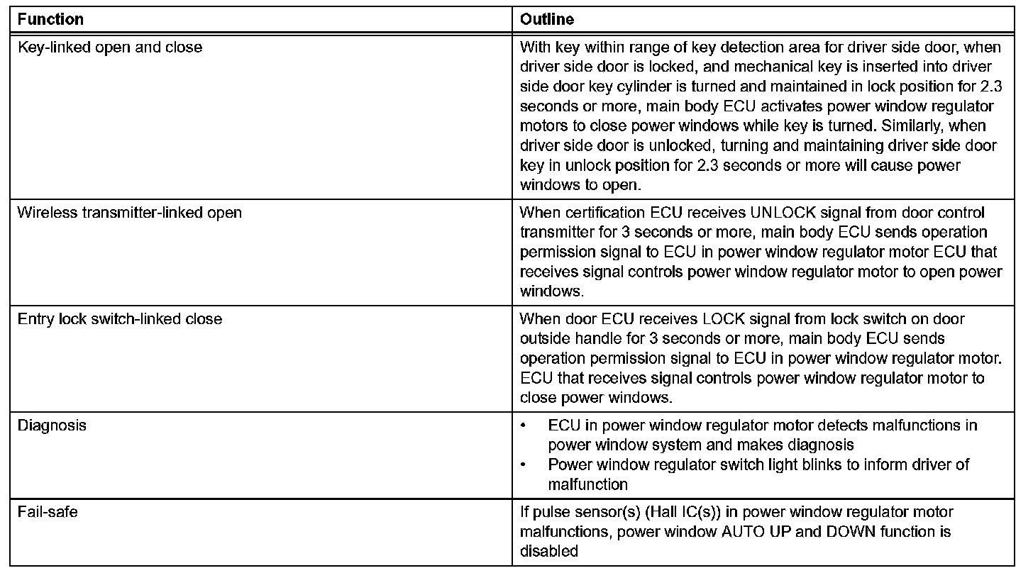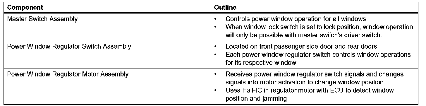 - The power window control system controls the power window UP / DOWN function using the power window regulator motors. The main controls of this system are the master switch which is built into the driver side door, and the power window regulator switches which are built into the front passenger side door and rear doors.