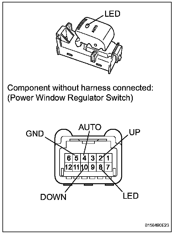 c. Apply battery voltage to the power window regulator switch and check that the LED illuminates.